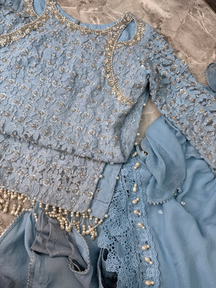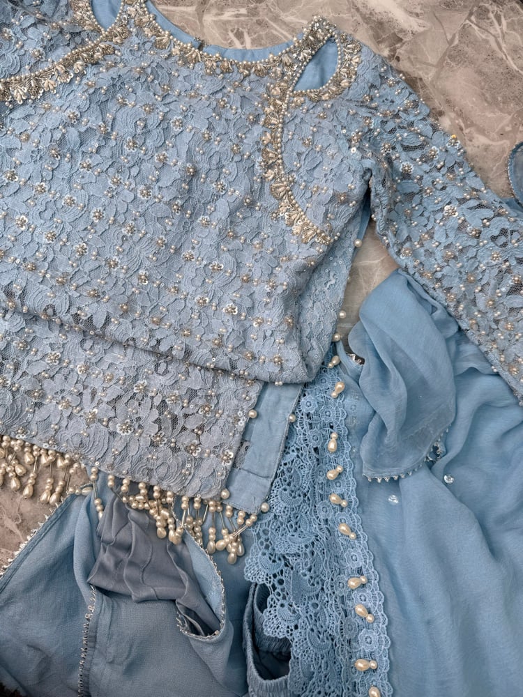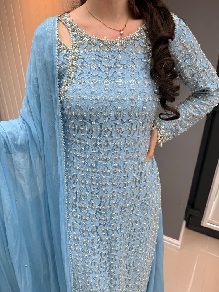 A stunning blue luxury floral net with beading all over. Stunning pret neckline with addawork. Opening and closing sleeves with work on the arm cuffs