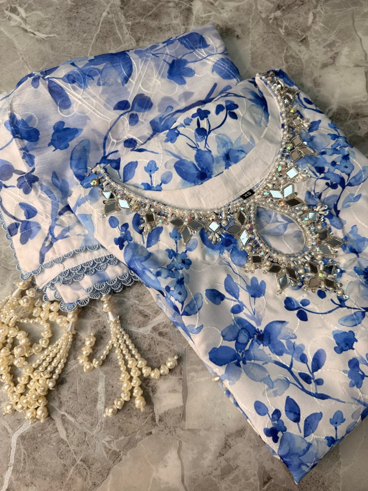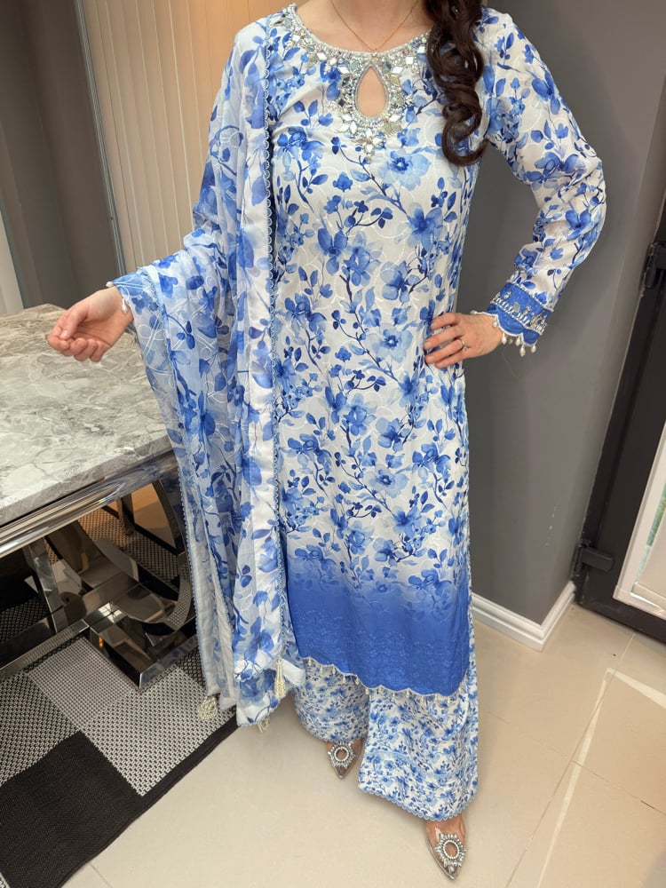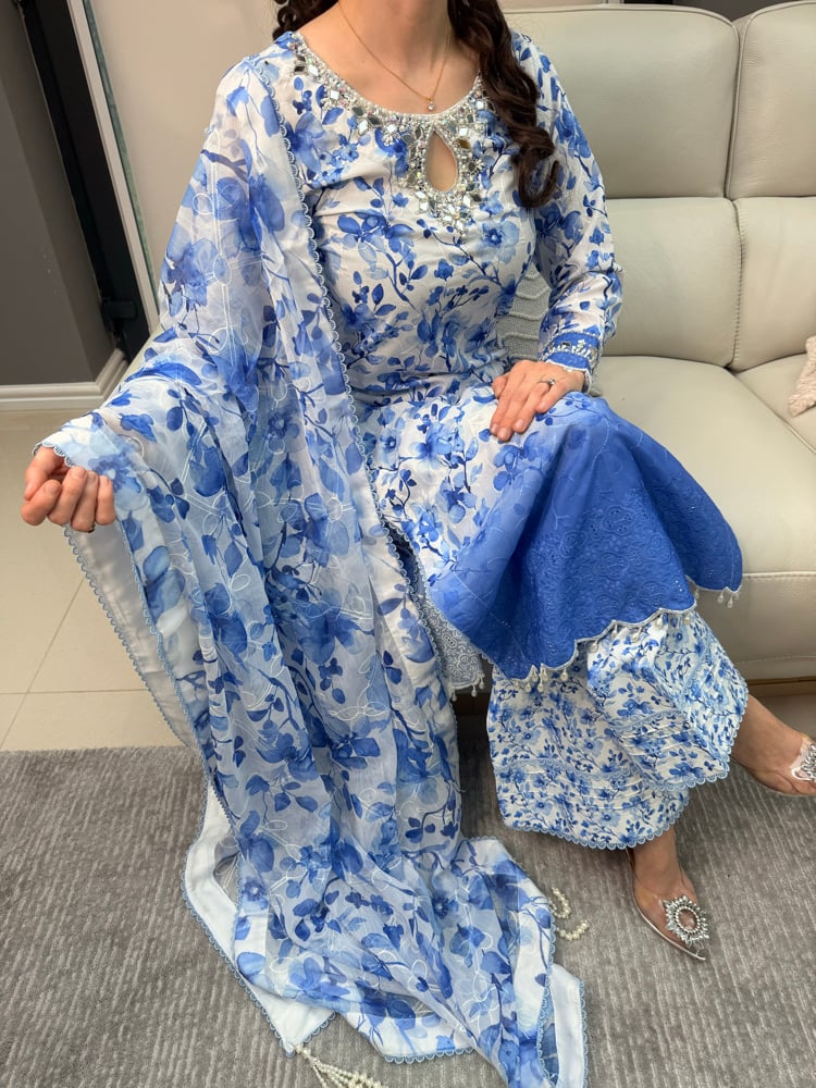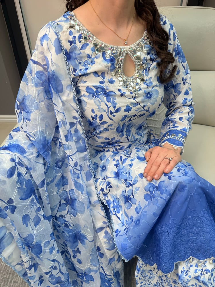 Blue floral georgette chikankari outfit. Can be worn as a two piece or with dupatta for a more formal look. Wide leg trousers which continue the floral print. Perfect for the changing weather - airy breathable fabric.