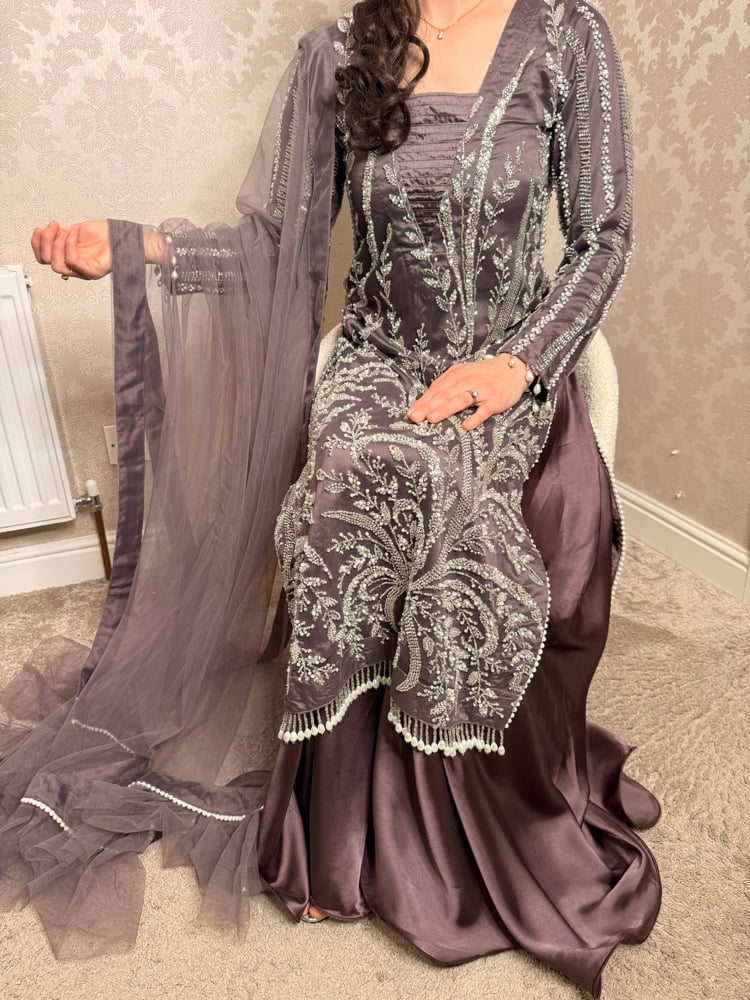 Stunning mauve purple cutdana outfit. Stunning pure silk sharara trousers and a net frill dupatta.